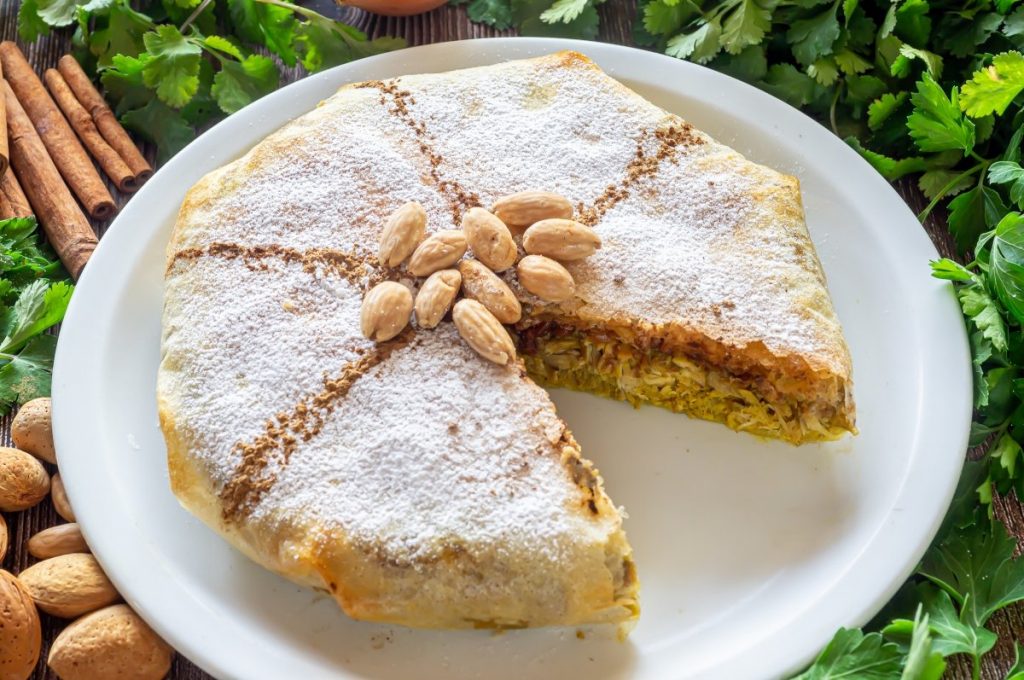 La pastilla es una receta única que combina lo dulce y lo salado, lo cual es característico de muchas recetas marroquíes. Tradicionalmente hecha con paloma, aunque hoy en día se utiliza más comúnmente pollo, este pastel se rellena con carne desmenuzada, almendras, cebollas caramelizadas y una mezcla de especias dulces como la canela. La pastilla se envuelve en una capa crujiente de masa filo y se espolvorea con azúcar glas y canela antes de servirla, lo que le da un toque dulce.